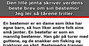 Den lille jenta skriver et brev om sin bestemor. Jeg ler så tårene triller.