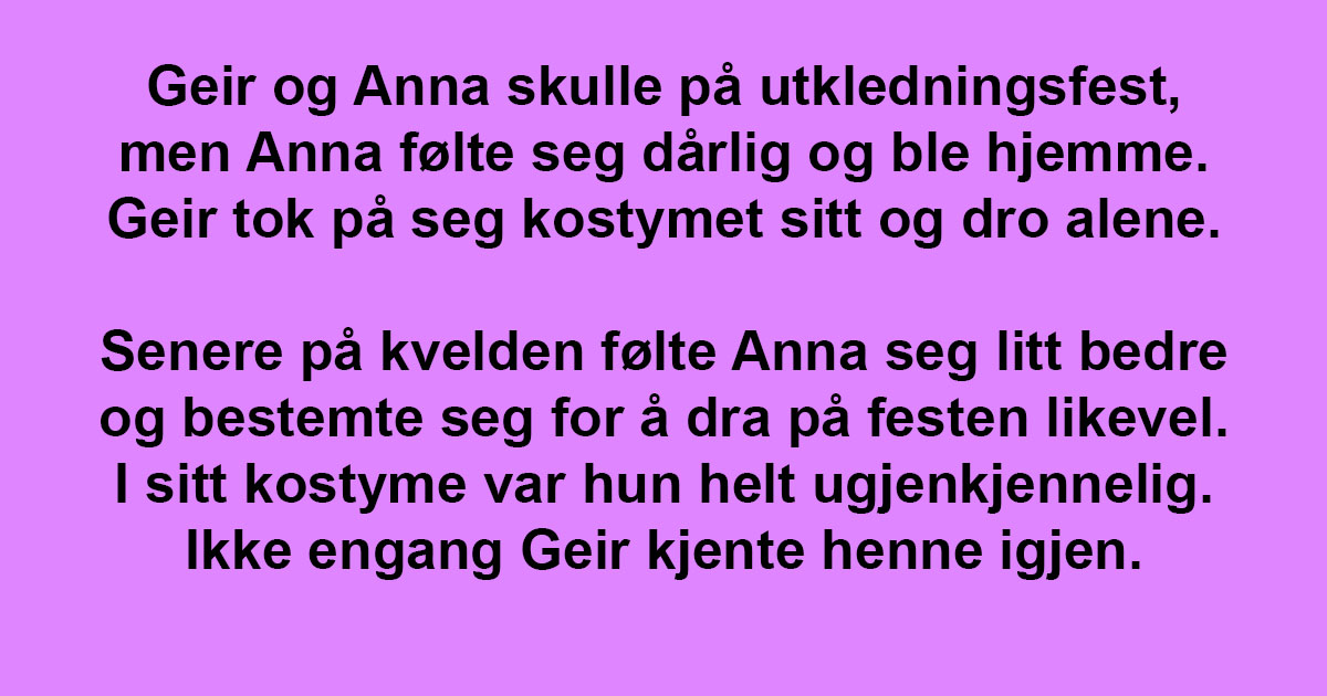 Senere på kvelden følte Anna seg litt bedre og bestemte seg for å dra på festen likevel. I sitt kostyme var hun helt ugjenkjennelig. Ikke engang Geir kjente henne igjen.